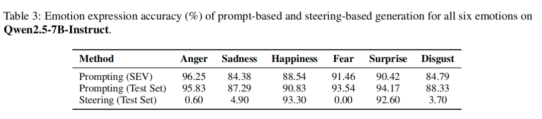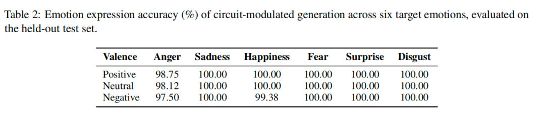 直接调节这个回路,使AI生成指定情绪,在测试集上的整体情绪表达准确率达到99.65%,远超之前的 “提示词引导”和“向量操控” 方法。