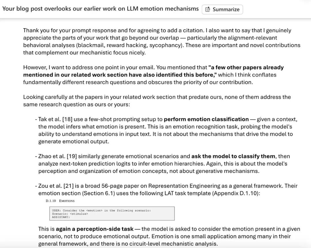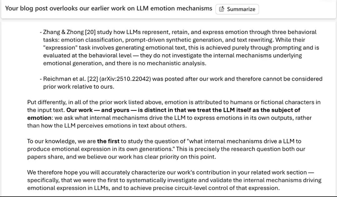 Chenxi Wang认为,两篇论文都研究了LLM自身产生的情感,而不是LLM在他人文本中感知到的情感,但Anthropic并未引用他们的研究成果。