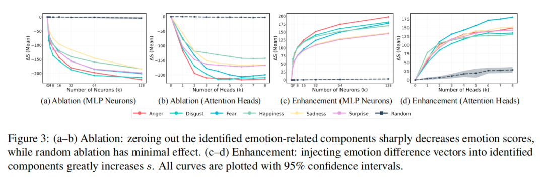 1、消融实验:把这些核心的神经元/注意力头关掉,AI的情绪表达能力会骤降,而且只需要关2-4个神经元、1-2个注意力头,效果就会大幅下降。