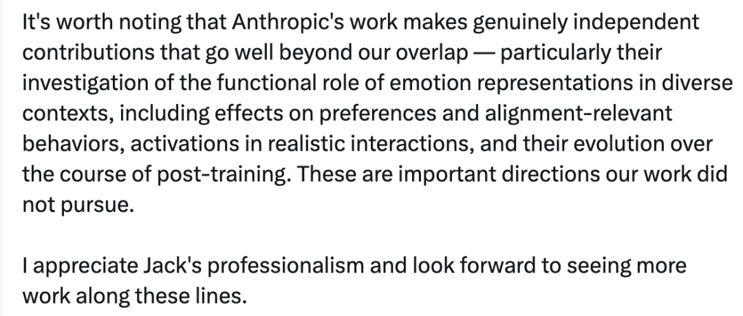 她也指出,通讯作者Jack Lindsey在整个交流过程中,始终保持尊重的态度,并真诚地参与到技术论证中。