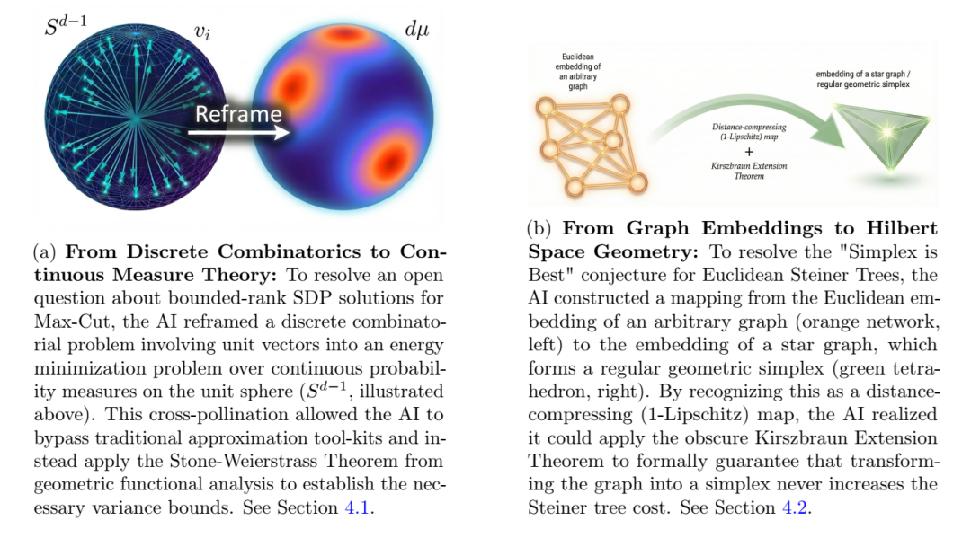 深度文献综合与关联:AI 模型能够识别不同领域之间隐蔽的联系(例如,将斯坦纳树与 Kirszbraun 扩展定理联系起来),这些联系即便是人类专家也可能忽略。