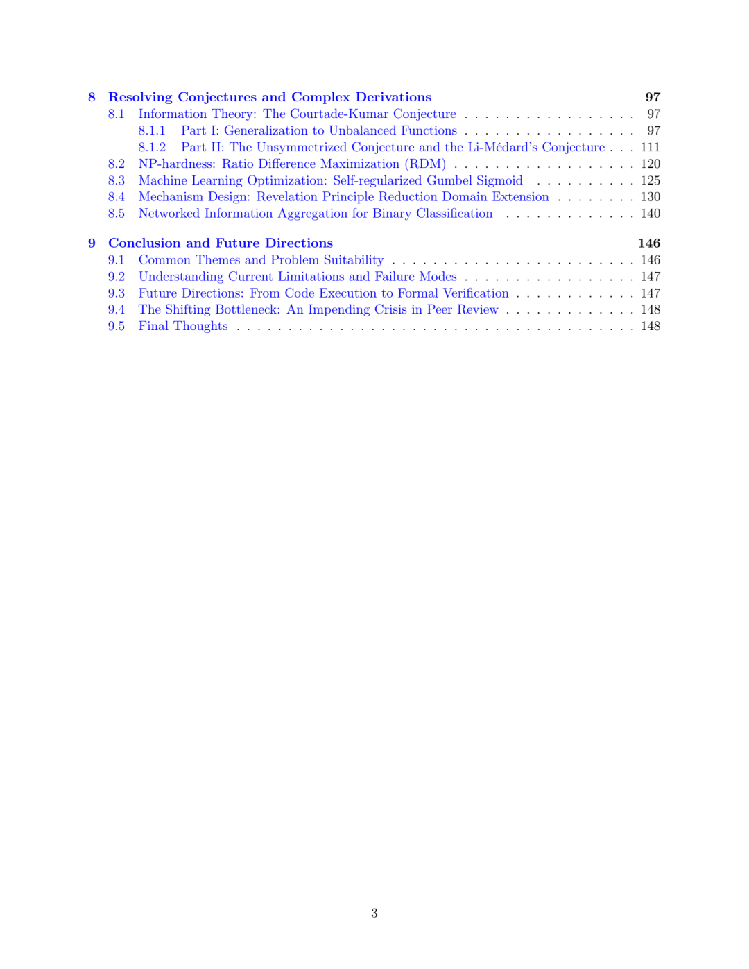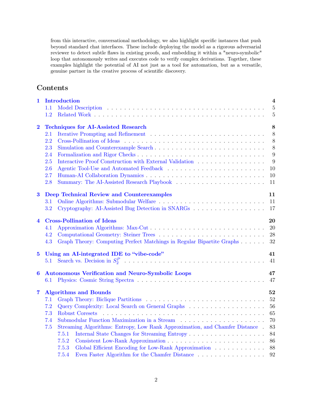 与 OpenAI GPT-5 实验的对比:OpenAI 的同期工作 [17] 记录了一系列案例研究,展示了 GPT-5 在生物、物理及数学等领域的科研贡献能力。虽然我们与他们的工作都强调了前沿模型作为研究助手的潜力,但在范围和重点上存在差异。我们的工作更侧重于理论计算机科学 (TCS),涵盖了广泛的子领域,包括算法博弈论、近似算法、复杂度理论、密码学、图论、信息论、最优化、在线算法、流算法和查询复杂度。