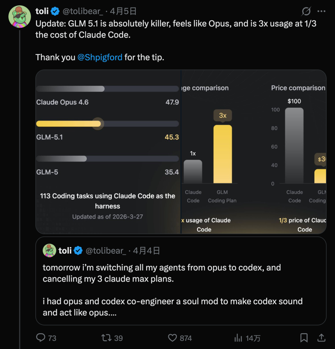 它的手感和Opus一模一样,使用额度是Claude Code的3倍,成本却只有1/3。