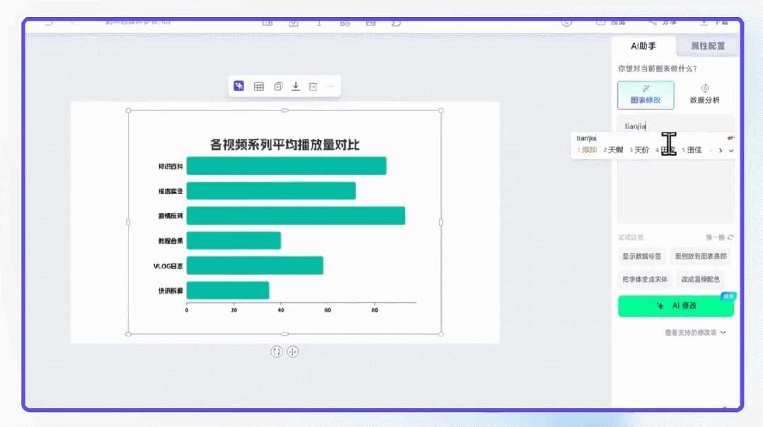自动模式:直接自然语言下指令,“按数值降序排列”、“添加数据标签”,AI会秒级响应并实时重绘。