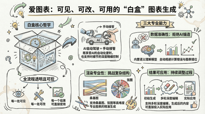 “白盒”是爱图表的产品价值观:尊重人的主体性,让AI生成的每一步可见、每一处可改、每一个结果可用,具体体现在: