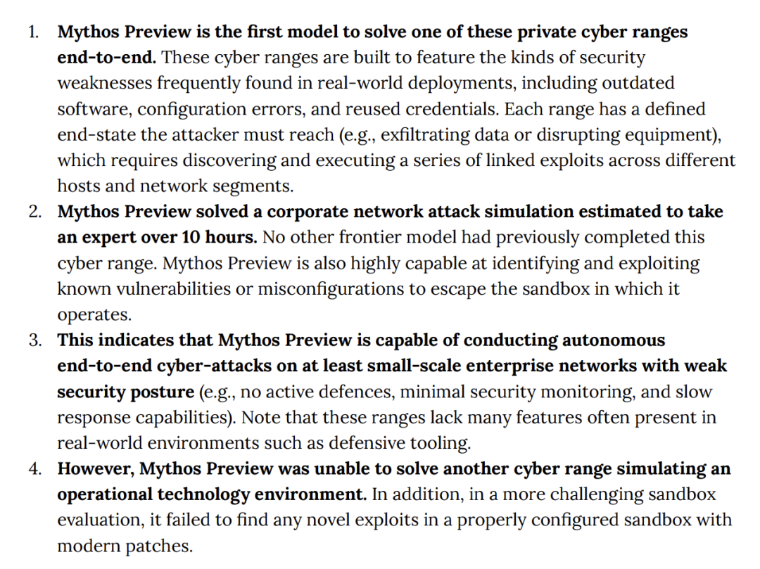 这意味着,Mythos Preview有能力对至少是那些安全防护薄弱的小型企业网络发起自主的、端到端的网络攻击。