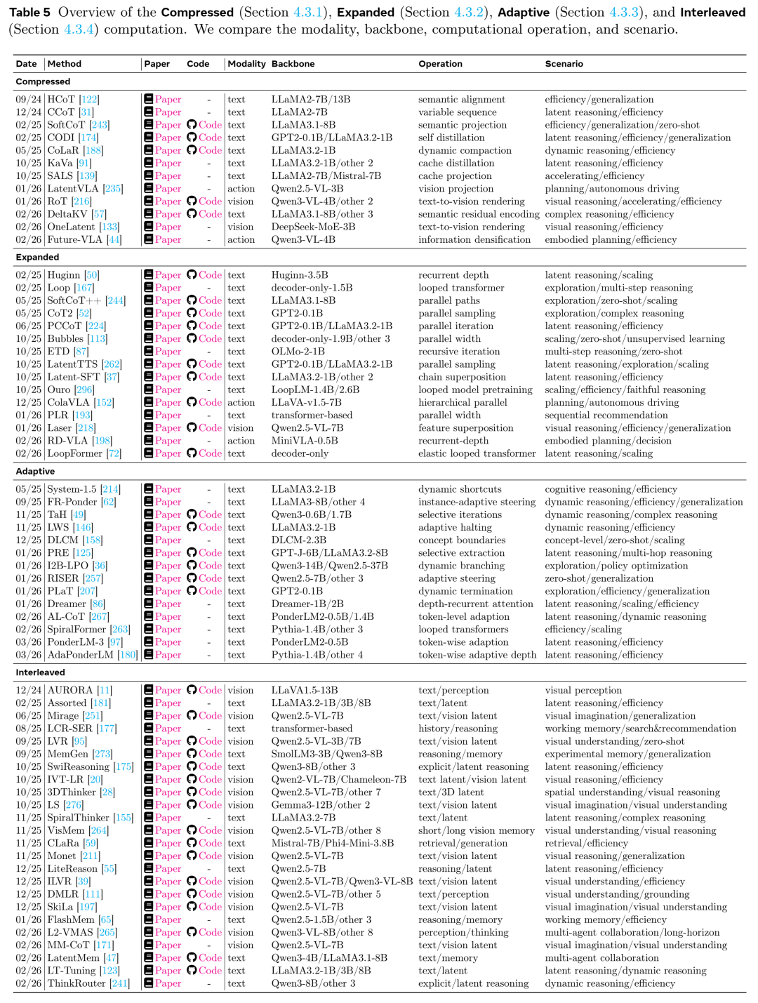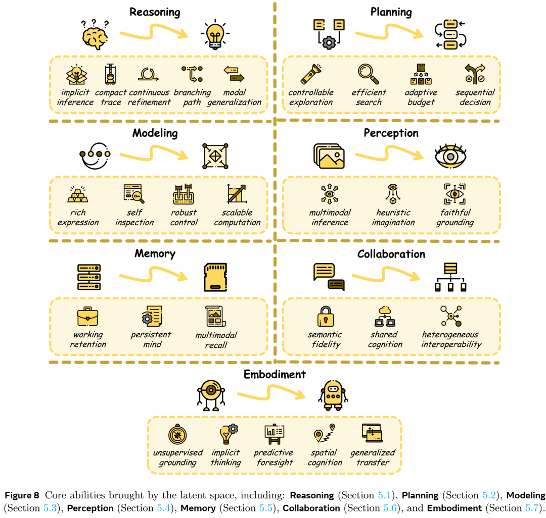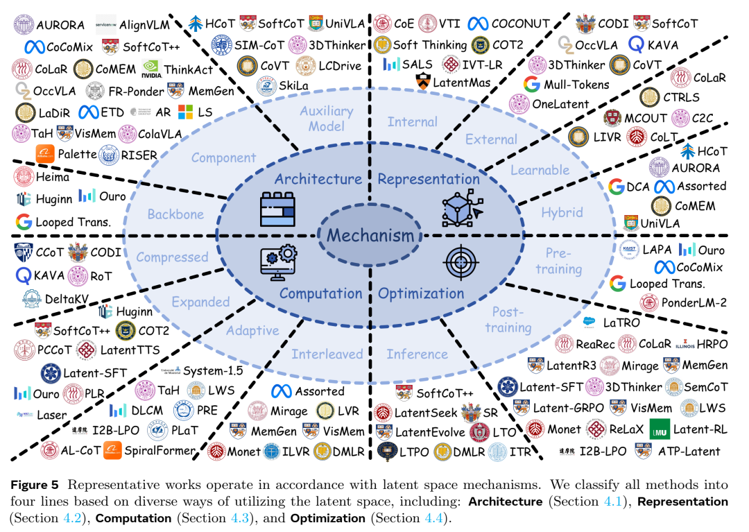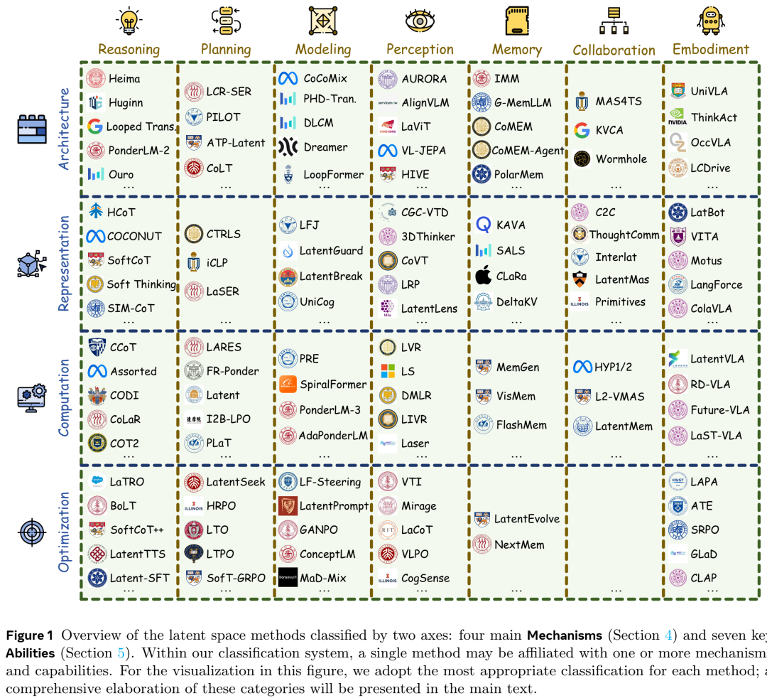 在这种循序渐进的叙事中,我们的技术综述锚定在图 1 所示的二维分类法上。第一维度是机制(Mechanism),关注潜空间是如何构建和使用的,涵盖四个主要主线:架构、表示、计算和优化。第二维度是能力(Ability),关注潜空间赋能了什么,涵盖七个主要能力领域:推理、规划、建模、感知、存储、协作和具身智能。这种设计使我们能够保持清晰的综述主线,同时通过共同的设计原则和能力成果来对比各种方法。