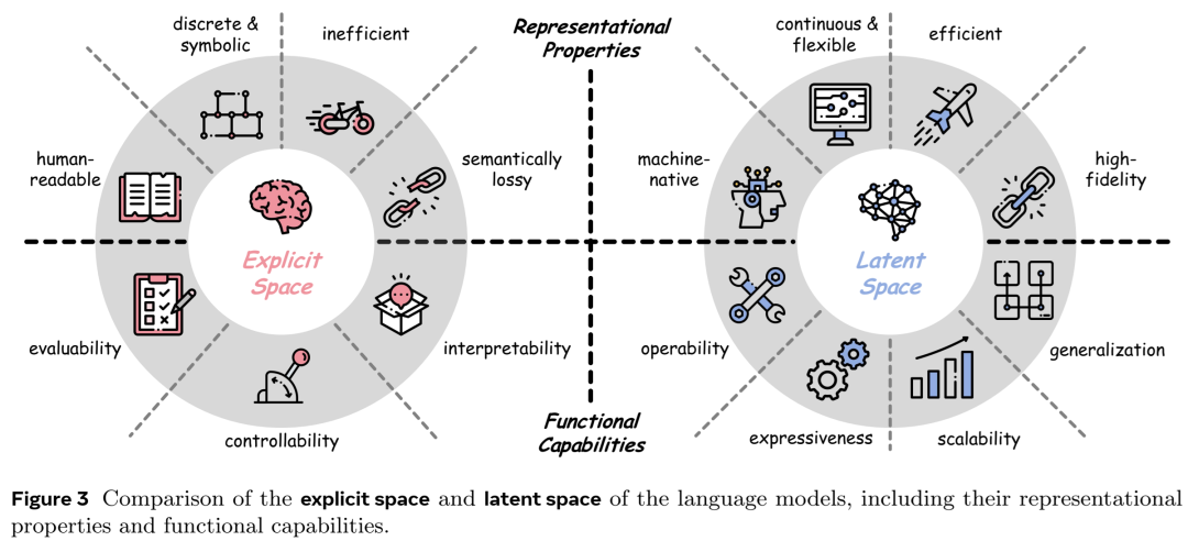 基于语言的模型——包括大语言模型(LLMs)、视觉-语言模型(VLMs)、视觉-语言-动作模型(VLAs)以及基于语言骨干构建的智能体系统——近期的进展通常仍被理解为通过显式的 Token 级生成(Token-level generation)实现的,即其输入、输出乃至中间推理过程均以人类可读的形式表达 [202, 219, 254]。然而,这种以 Token 为中心的架构框架正日益显现其局限性 [11, 58, 186]。由于此类模型中的计算本质上是通过连续激活(Continuous activations)展开的,潜空间正越来越多地被重新构想,它不再仅仅是一个隐藏的实现细节,而是一种机器原生的基质(Machine-native substrate),承载着诸如推理 [58, 243, 295]、感知 [11, 137]、存储 [264, 273]、通信 [290, 300] 和动作 [69, 142] 等功能。这一范式转变部分源于显式空间的结构性限制,包括其冗余性、离散化瓶颈、序列解码成本以及在复杂、多模态或长程任务设置中细粒度信息的潜在损失。相比之下,潜空间计算提供了一种更具连续性、紧凑性且表现力更强的介质,能够支持更高保真度的表示和更灵活的计算分配。