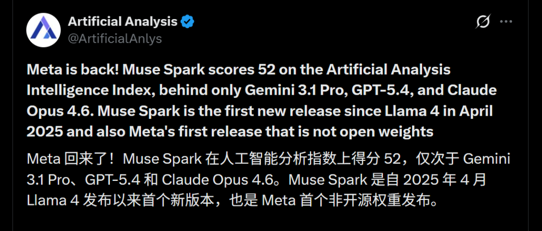 另外,Muse Spark的出生也终于让长期以来有关“Meta开闭源”的讨论盖棺定论: