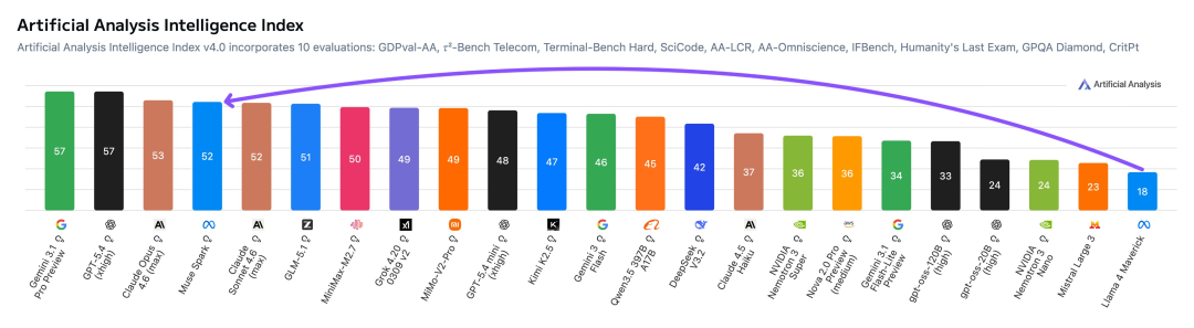 而顶尖高手+耗时9个月打磨,Muse Spark也总算让Meta在第三方测评中赶上第一梯队,一雪llama 4带来的前耻。