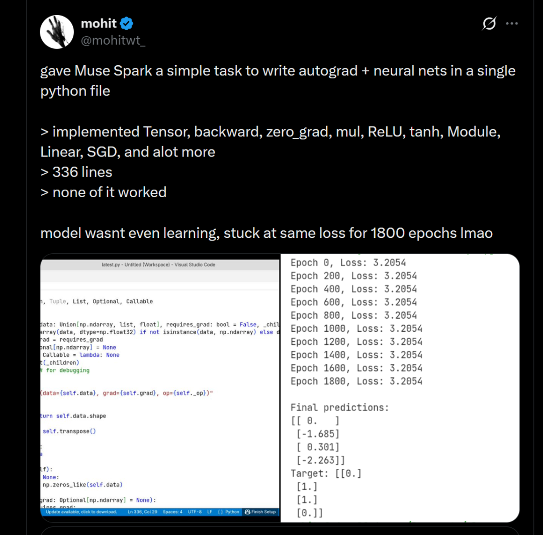 一个简单的编程任务,Muse Spark虽生成了一大堆东西,但根本跑不通。