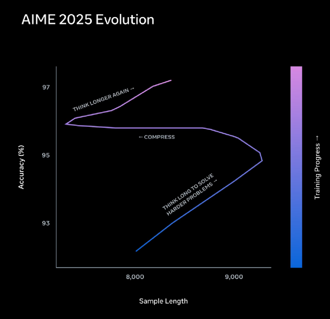 在预训练阶段,能够以比Llama 4 少10倍以上的计算量达到相同的性能水平。 强化学习训练展现出平滑且可预测的改进,具有良好的泛化能力和可扩展性。 Test-time阶段,在加入长度惩罚机制后,“思维压缩”开始生效,模型学会了用更少的token解决问题。