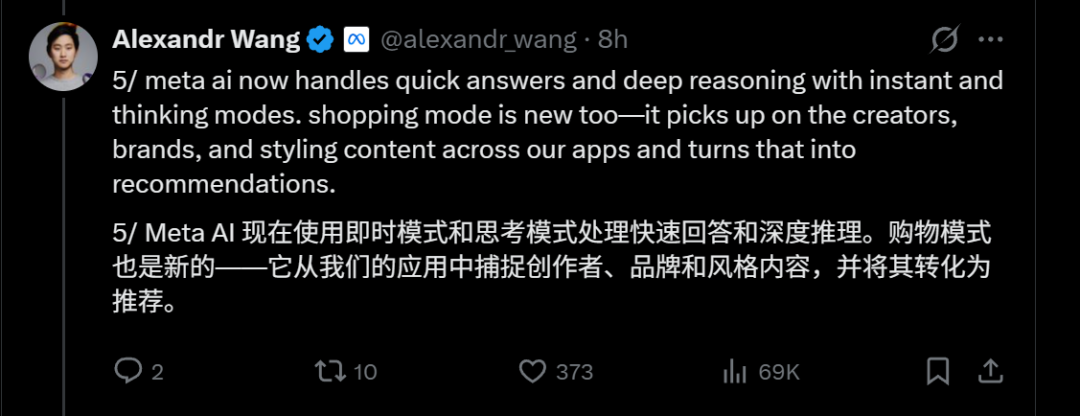 亚历山大王表示,模型会结合用户在ins、Facebook、Threads上关注的创作者和品牌偏好,做个性化的购物推荐。