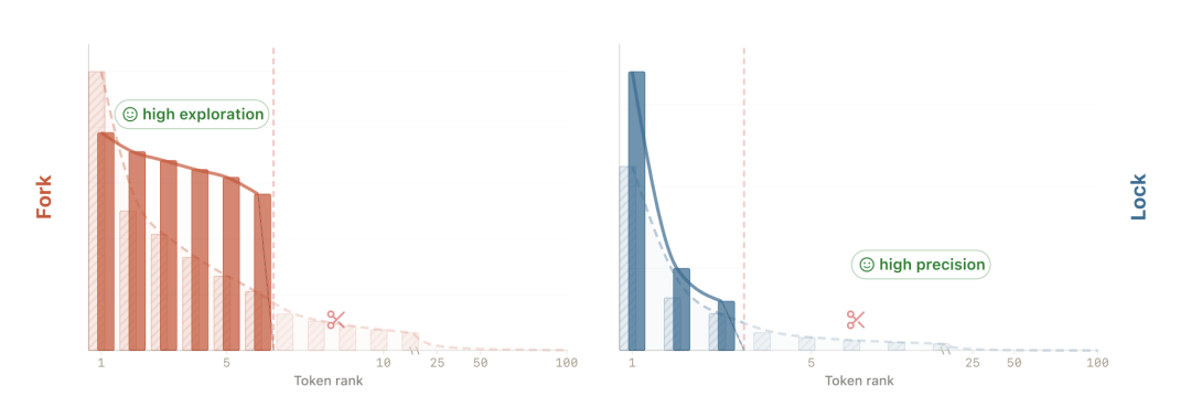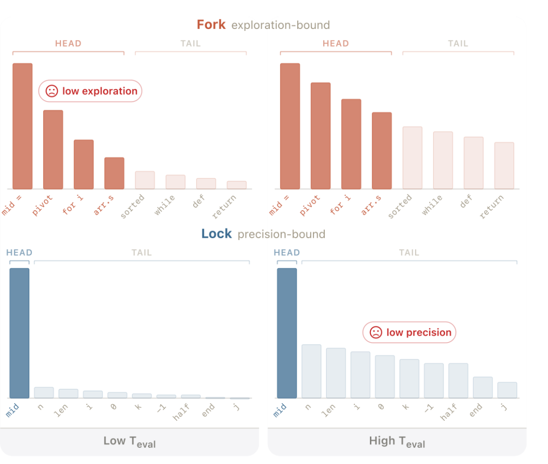 图 | 两种情境类型在低 Teval 与高 Teval 条件下的 token 分布情况,其中头尾质量分布特征被明确呈现。低 Teval 条件能保持 lock 的精确性,但会削弱 fork 的有效头部(探索能力不足);高 Teval 条件虽能恢复 fork 的探索能力,却会重新激活 lock 的干扰尾部(精度降低)。