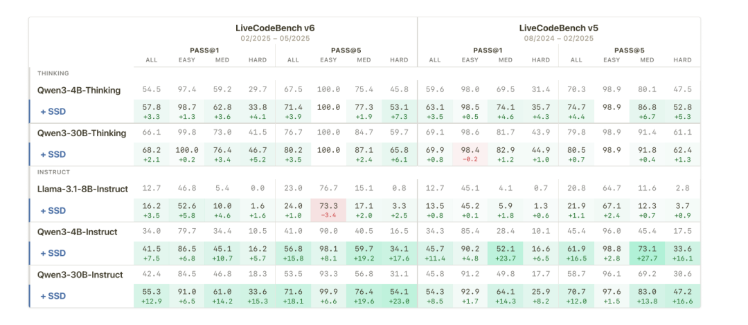 图 | SSD 在 LiveCodeBench 上提升了所有被评估模型的性能,其中在中等难度和高难度问题上提升幅度最大。结果展示 LCB v6 和 LCB v5 数据集的表现,按难度分级并按推理风格(思考型与指令型)分组。在每个模型对中,第一行是基础模型,第二行是加上 SSD 后的模型;单元格的阴影颜色表示相对于基础行的变化(绿色表示改进,红色表示下降)。