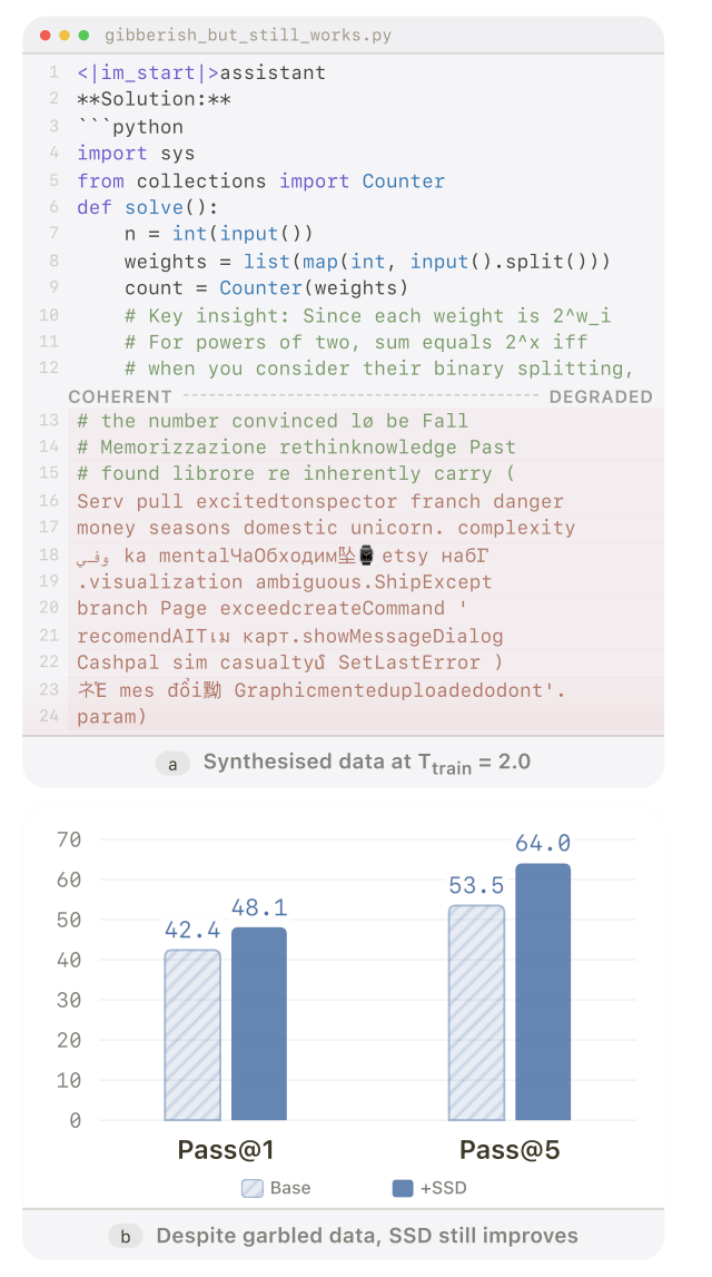 研究人员通过一项极端实验验证了这一机制。他们将训练温度设定为 2.0 且不进行截断,导致生成的数据中有 62% 无法提取有效代码。即便在这种训练数据质量极低的情况下,SSD 依然提升了模型性能,Pass@1 指标提升了 5.7%。这一结果证明,SSD 的有效性并非依赖于生成代码的正确性,而是源于对概率分布的重塑。