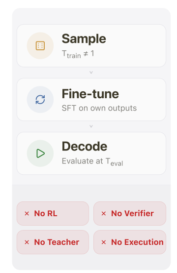 SSD 的实施流程包含三个步骤。首先是数据合成,研究者从基础模型中以较高的温度和特定的截断配置采样生成代码解决方案,每个问题仅采样一个解;然后是训练阶段,直接使用这些未经验证的原始输出作为目标,进行标准的监督微调;训练完成后,使用经过微调的模型,并在特定的解码参数配置下进行评估测试。