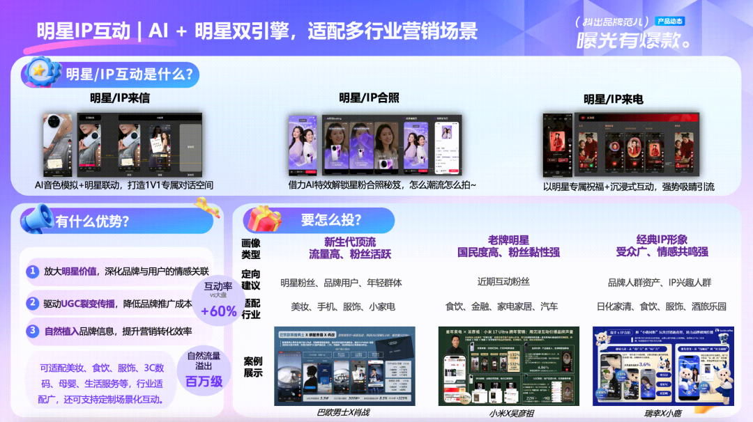 品星云AI营销用创新互动广告,把看广告变成了玩广告,彻底打破了传统广告单向传播的壁垒。AI明星来信、合拍、来电等玩法,搭载AI拍照、语音能力,打造1V1的沉浸式互动体验。