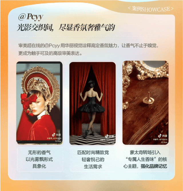像Pycc就通过把无形的香气以光雾飘形式具象化、匹配时尚精致党轻奢悦己的生活需求,再用蒙太奇专场引入“专属人生香味”的核心主题,强化了品牌记忆。