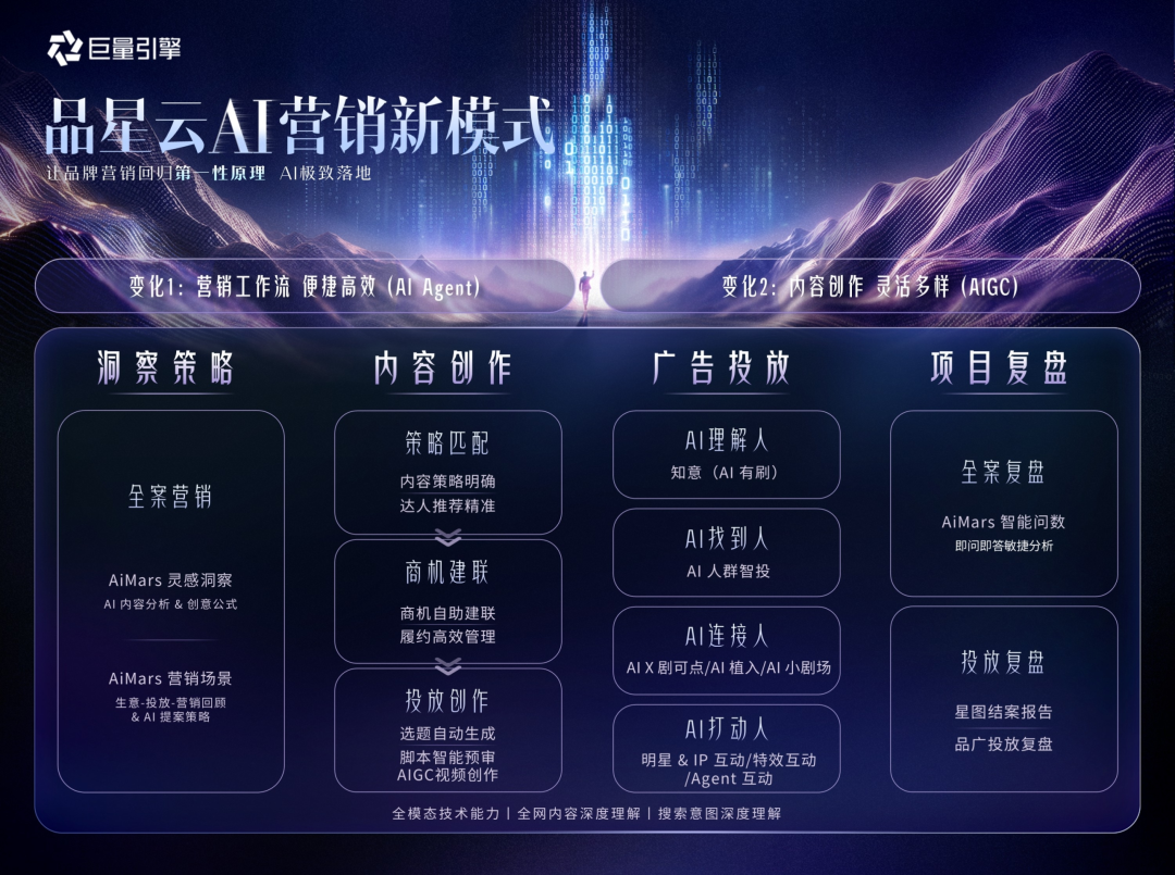 而巨量引擎品星云AI营销真正的突破,就是彻底跳出了单点AI工具的内卷陷阱,打造了一套打通“洞察-创作-投放-复盘”全流程的营销闭环,把品牌营销最核心的四大命题 ——“对谁说、说什么、怎么触达、怎么优化”,用AI全链路贯穿,从根本上重构了AI营销的玩法。