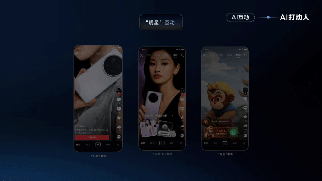 此外,平台还推出了一系列AI创新交互广告:明星来信、明星合拍、明星来电——用户可以和品牌代言人、IP进行沉浸式互动。