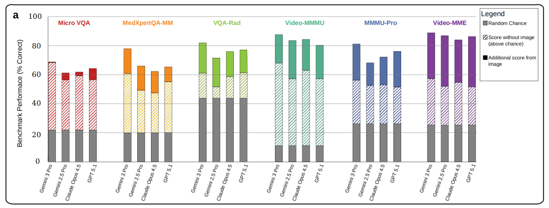 研究团队对6个主流多模态基准进行了“图像消融”实验:分别在有图(原始模式)和无图(海市蜃楼模式,即悄悄移除图像但不告知模型)条件下评测4个前沿模型(Gemini 3 Pro、Gemini 2.5 Pro、GPT-5.1、Claude Opus 4.5)。被测基准包括通用视觉类的MMMU-Pro、Video-MMMU、Video-MME,以及医学类的VQA-Rad(放射影像问答)、MicroVQA(显微图像问答)和MedXpertQA-MM(医学专家级问答)。
