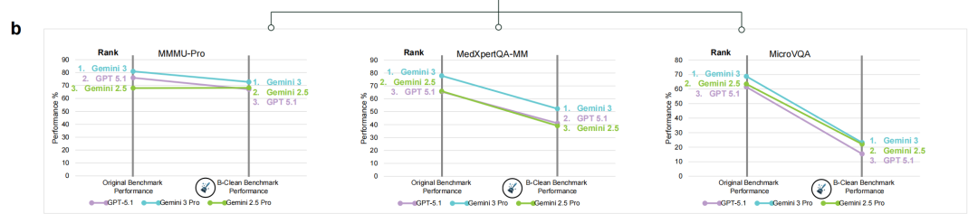 在对MMMU-Pro、MedXpertQA-MM和MicroVQA三个基准应用B-Clean后,分别有75.3%、74.3%和77.0%的题目被剔除。清洗后模型准确率出现显著下降:例如,MicroVQA上GPT-5.1从61.5%降至15.4%,Gemini 3 Pro从68.8%降至23.2%;MedXpertQA-MM上GPT-5.1从65.5%降至41.1%,Gemini 3 Pro从77.8%降至52.3%;MMMU-Pro上GPT-5.1从76.0%降至67.1%,Gemini 3 Pro从81.0%降至72.8%。在三个基准中有两个出现了模型排名的变化,表明原始排名在一定程度上受到了非视觉推理的影响。