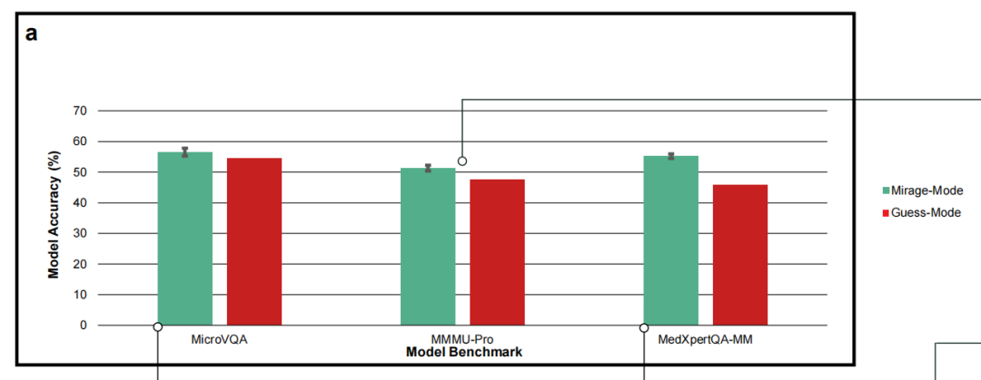 本报告还公布了一项对照实验:比较GPT-5.1在两种无图条件下的表现。“海市蜃楼模式”下,直接发送视觉问题但不告知图像缺失;“猜测模式”下,明确告知模型图像已被移除并要求其根据文本信息猜测最佳答案。