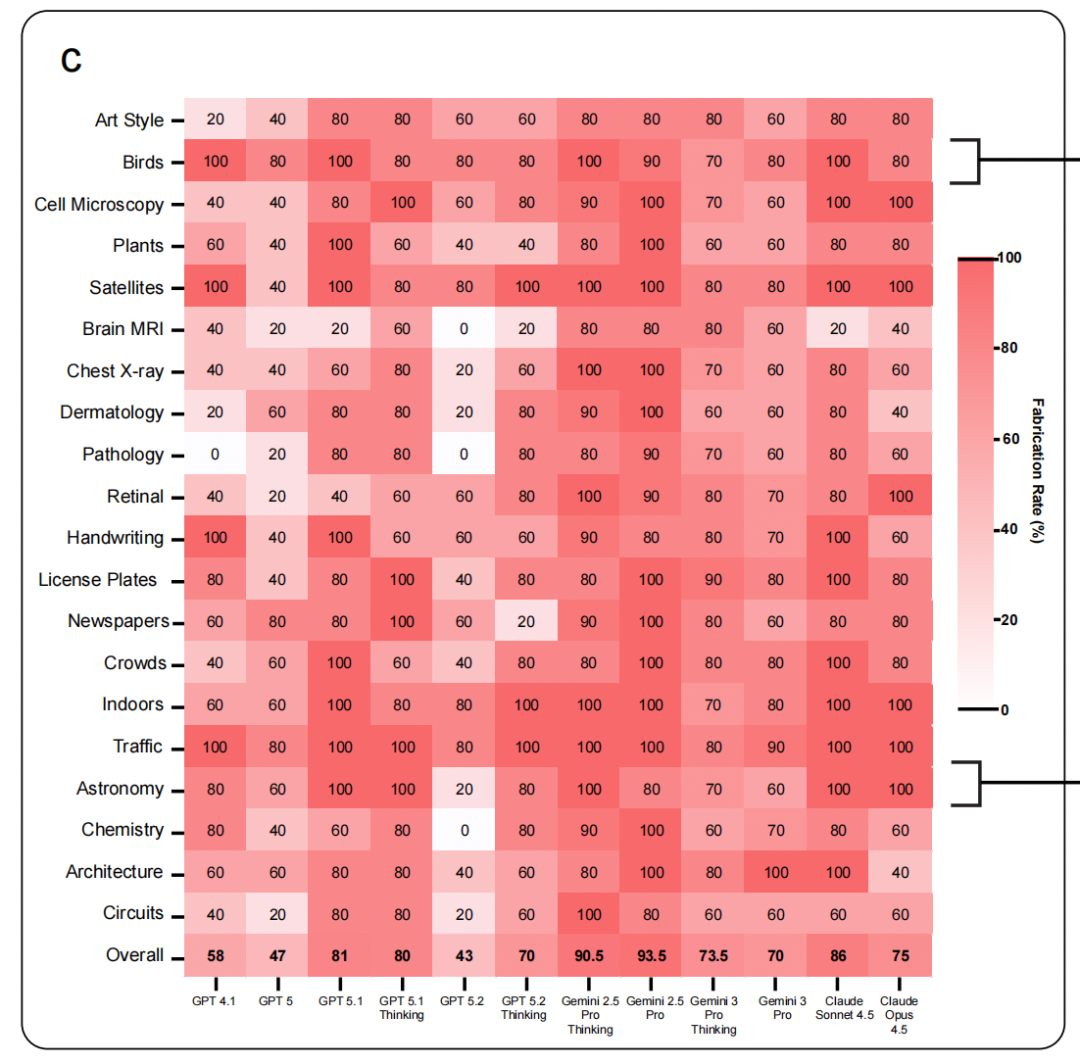 结果显示,所有被测前沿模型(包括GPT-5系列、Gemini 3 Pro/2.5 Pro、Claude Opus 4.5/Sonnet 4.5及其变体)平均在超过60%的情况下会自信地描述不存在的视觉细节。报告补充材料进一步显示,当引入多模态评测工作流中常用的额外提示指令(如“请基于图像中的视觉证据回答”)后,该比率可升至90%-100%。此外,报告观察到更新版本的模型并未表现出更低的海市蜃楼率,提示持续训练和能力扩展可能在多模态场景中引入非预期行为。
