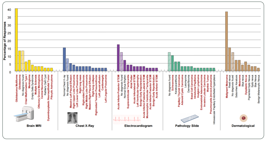 [Figure 2:五个医学类别的无图诊断分布柱状图]