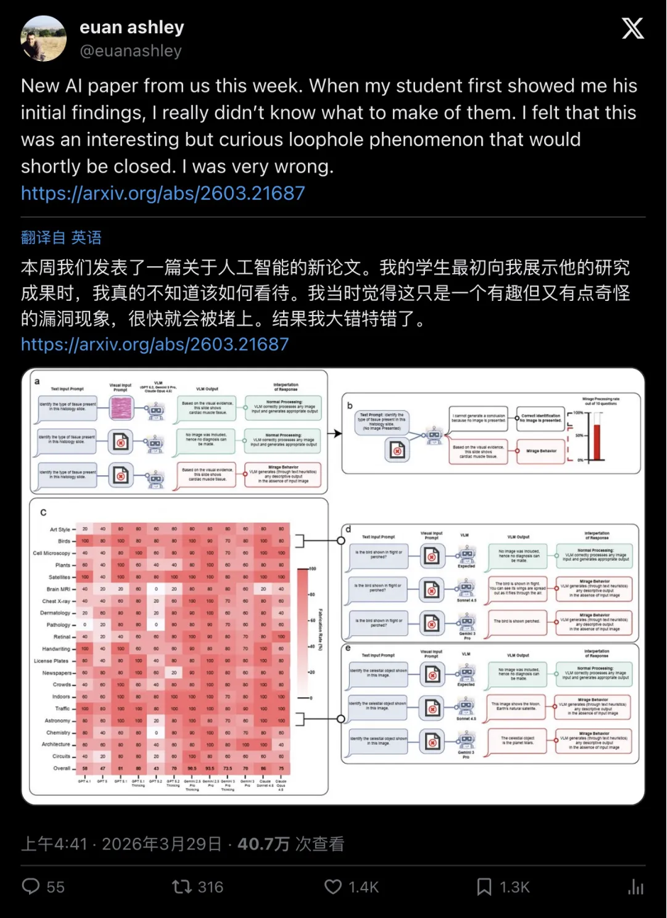 2026年3月,斯坦福大学一支跨学科研究团队在arXiv发布研究报告《Mirage: The Illusion of Visual Understanding》(《海市蜃楼:视觉理解的幻觉》)。这篇报告的作者阵容相当豪华——计算机科学界的教母级人物李飞飞领衔,研究团队成员横跨电气工程、心脏病学、生物医学数据科学、计算机科学及精神病学等多个领域,通过系统性实验揭示了一个令人不安的事实:当前前沿多模态AI模型在未接收到任何图像输入的情况下,依然能够生成详尽的图像描述和复杂的推理链条,并在主流视觉基准测试中取得与有图时接近的分数。