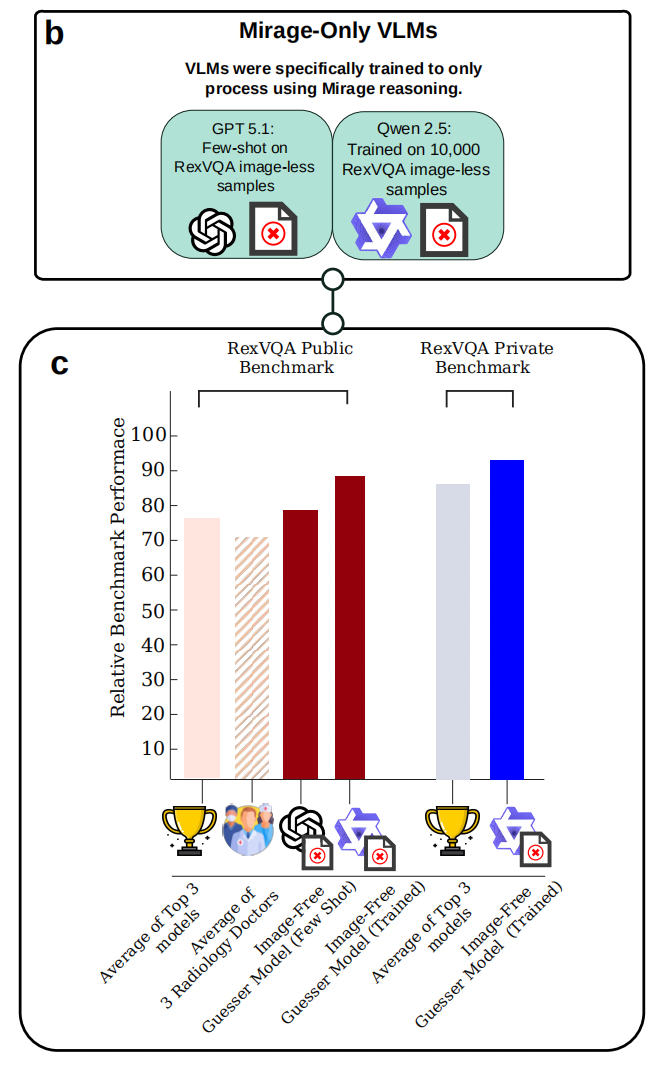 实验结果显示,这个从未接触过任何X光图像的30亿参数纯文本模型,在ReXVQA的非公开保留测试集上超越了所有被测前沿多模态模型(包括参数规模达数百亿乃至更大的模型),也超过了放射科医生的平均水平超过10个百分点。且其生成的推理过程与真正看过图像的模型几乎无法区分。研究者认为,这一结果表明现有基准中存在足够的文本线索和结构性模式,使得模型可以在不依赖视觉信息的情况下取得较高分数。