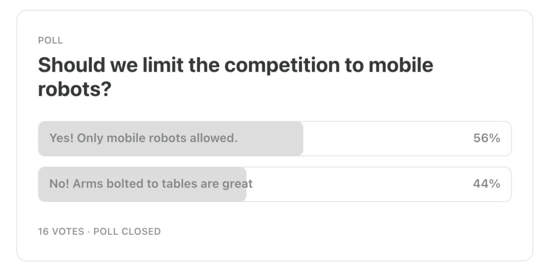 他把决定权交给网友,投票结果显而易见,只允许可移动的机器人参赛。(难度又又又加大了)