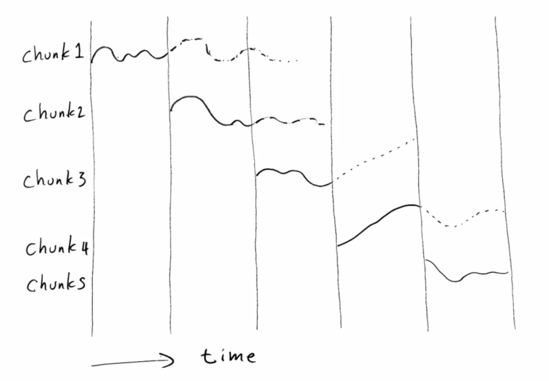 如图所示,机器人的一个关节沿着Chunk 1的路径运动,直到Chunk 2出现的垂直线,然后你开始沿着该路径运动,直到Chunk 3出现,依此类推。