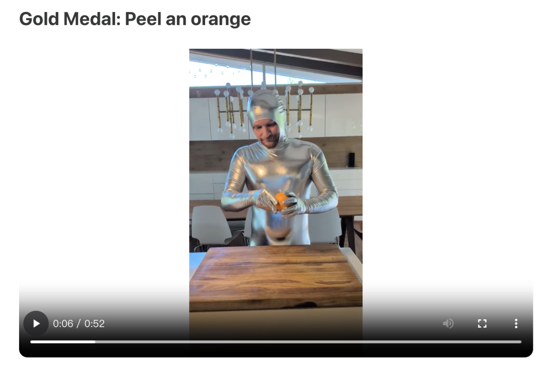 对机器人指尖的考验:“卷起配对的袜子”是铜牌;“使用狗粪袋捡起便便”是银牌;“剥橙子”是金牌。