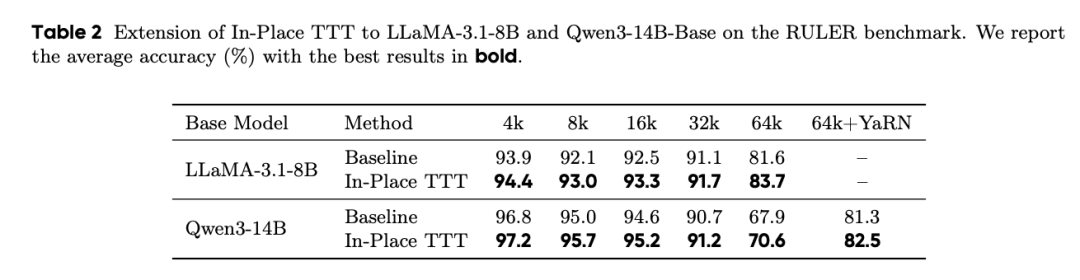 实验证明,Qwen3-4B、Llama3.1-8B、Qwen3-14B在装备In-Place TTT之后,都原地变强了,并且在长文本任务上提升尤为明显。