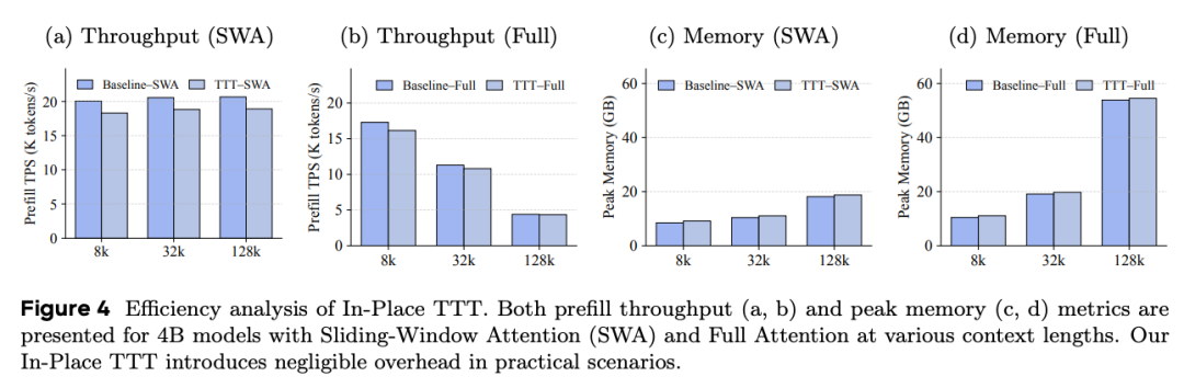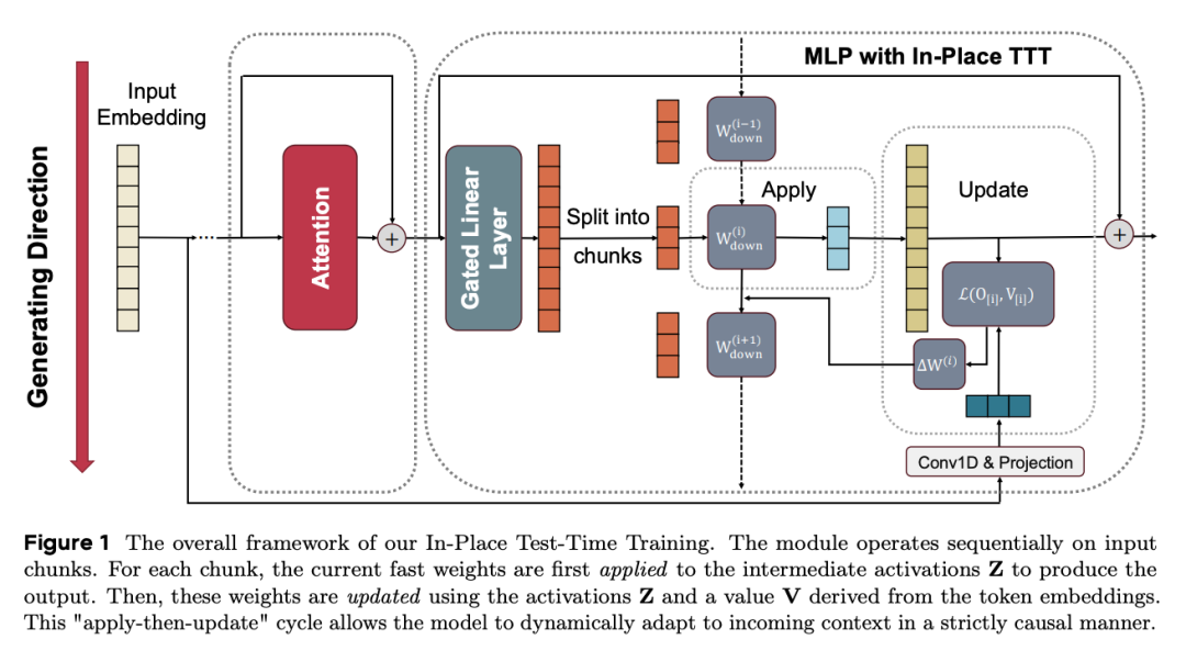 In-Place TTT是对MLP进行改造,保留了原有的注意力层,这就使得该方法可以实现分块更新,不用再逐Token去处理。