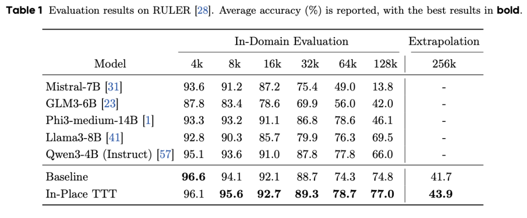实验表明,In-Place TTT能大幅提升现有模型(如Qwen3-4B)在128K甚至256K长上下文任务中的表现。