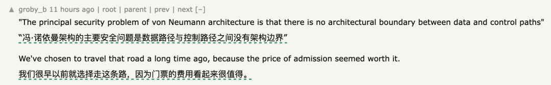 有技术大佬指出,这就如同早期的冯·诺依曼架构,数据和控制指令在内存中没有任何物理隔离。