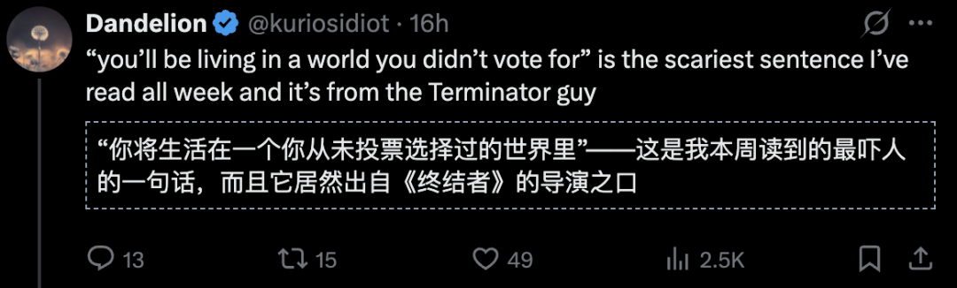 人类将来「生活在一个自己从未同意、从未投票的世界里,与一个超级智能的外星物种共存,而这个物种只听命于企业的目标和规则」。