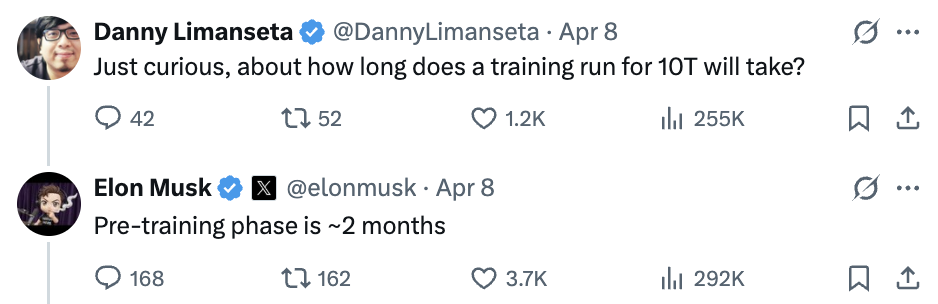 比如有人问“训练一个10T模型,大概要花多久?”,马斯克说预训练阶段大约需要2个月。