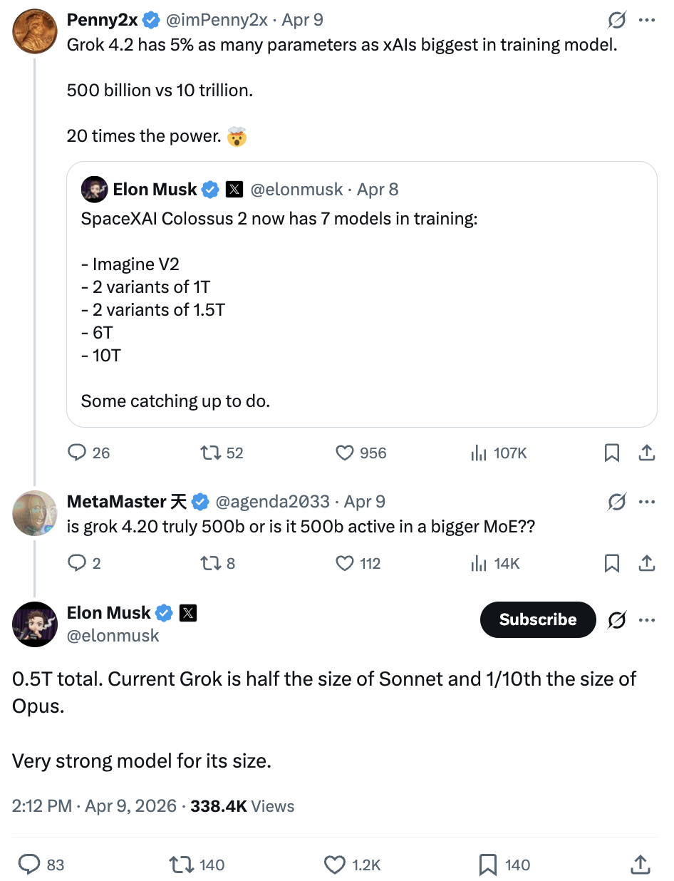 Grok 4.2真的是总参数量500B吗?还是说只是在一个更大的MoE里,激活的参数量是500B亿?