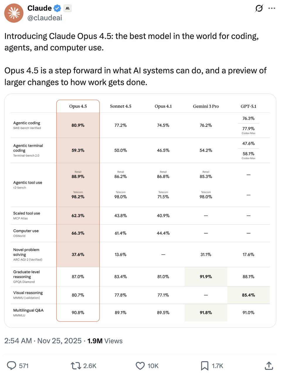 Claude Opus 4.5后脚跟上,前端开发、视觉能力显著提升,更擅长使用电脑;在深度研究、PPT制作与电子表格处理等日常任务方面的表现也全面升级。