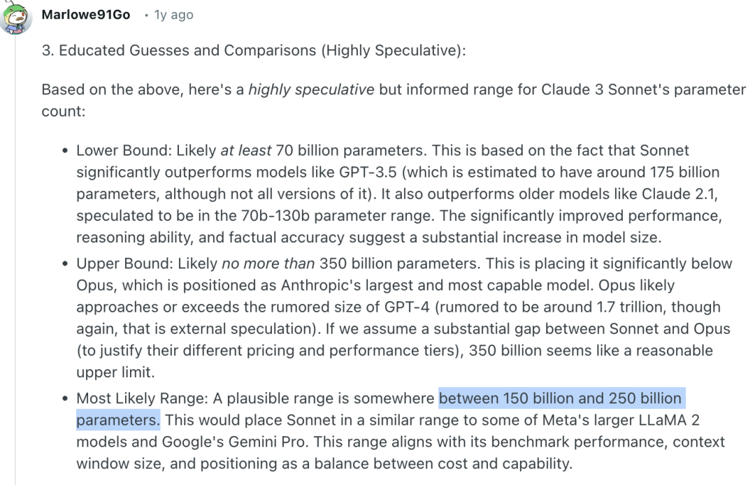 对于Claude 3 Sonnet,Reddit社区后续也展开了持续讨论,也有网友基于性能等推测Claude 3 Sonnet参数量在150-250B之间。