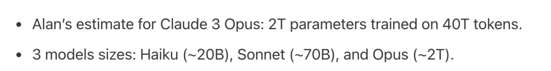 Claude 3 Haiku (~20B)、Claude 3 Sonnet (~70B)、Claude 3 Opus (~2T)。