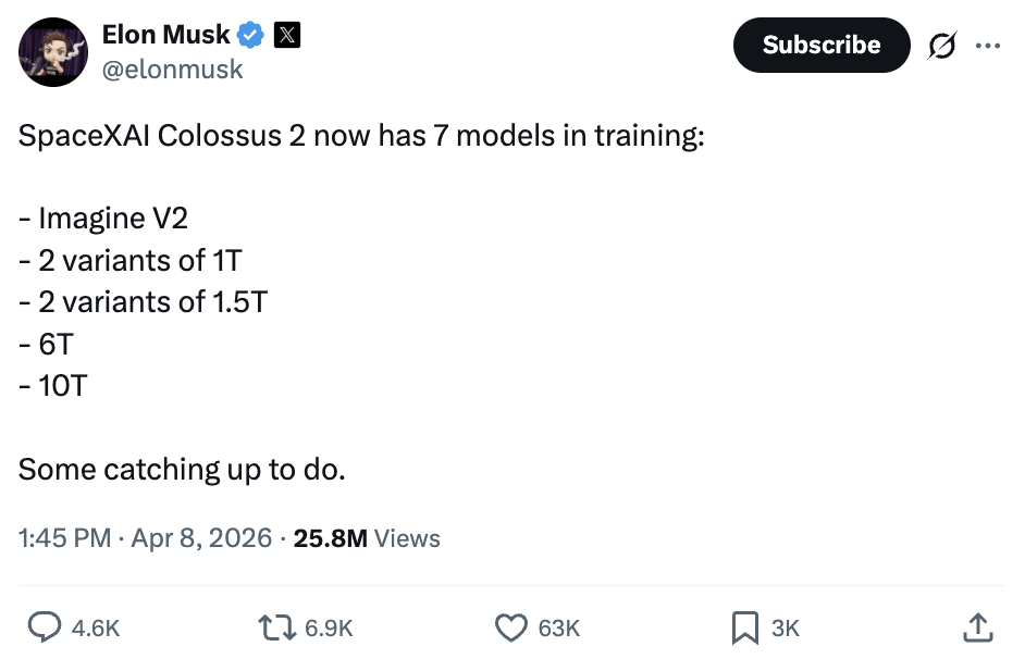 起因是老马发帖表示,xAI的Colossus 2超算正在训练7个模型,其中最大的一款,参数量直接冲到了10万亿。
