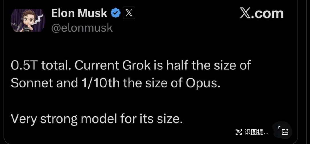 总参数量就是0.5T(5000亿)。现在的Grok,参数量是Sonnet的一半、Opus的十分之一。以它的规模来说,是非常强的模型。