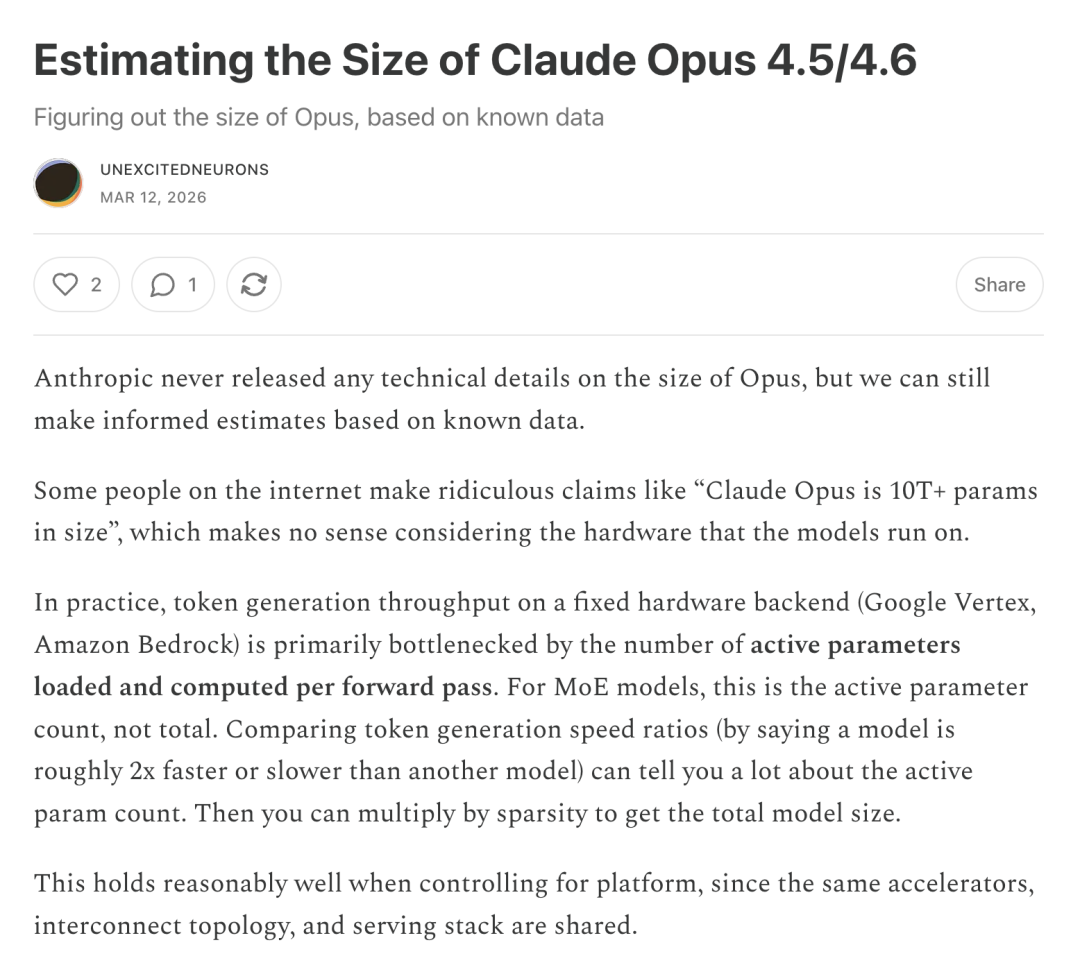 最近,一篇发表在Substack的技术逆向工程分析,通过OpenRouter在Google Vertex和Amazon Bedrock上的Token吞吐数据,估算了Claude Opus 4.5和4.6的激活参数量。
