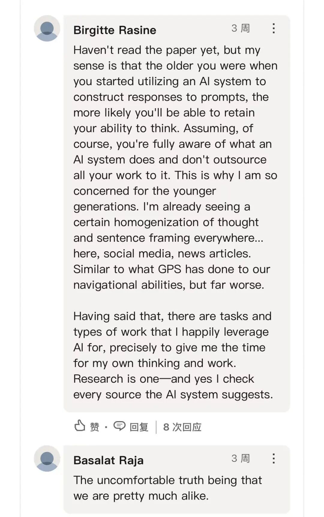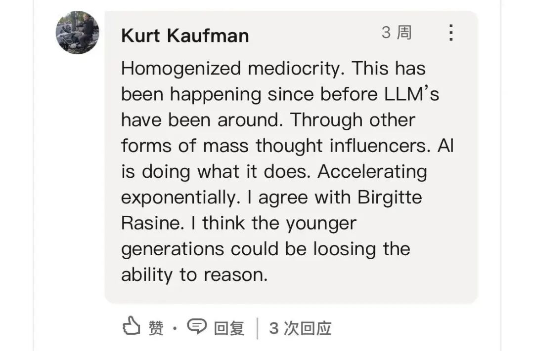 也有人指出:平庸的同质化在AI出现之前就已经发生了,但AI的加速发展,使年轻一代可能正在丧失理性思考的能力。
