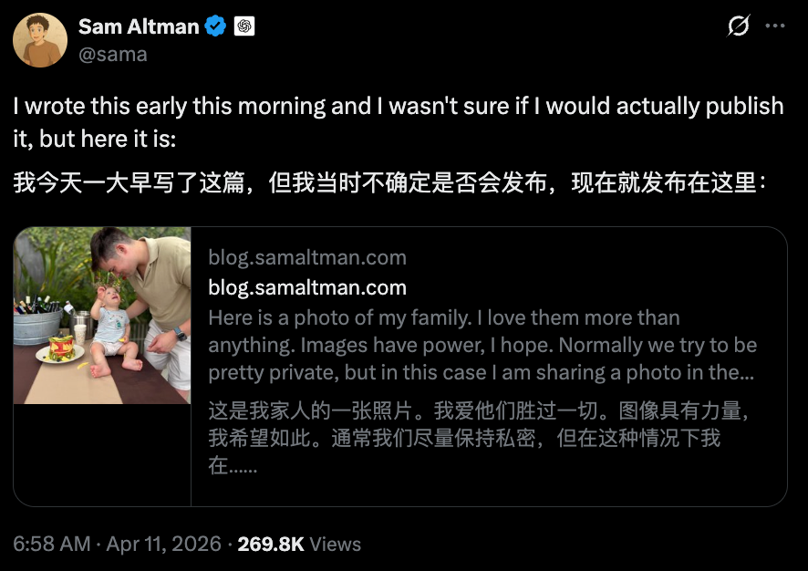 Sam Altman刚刚发文报了平安:所幸燃烧瓶偏离了房屋,无人受伤。